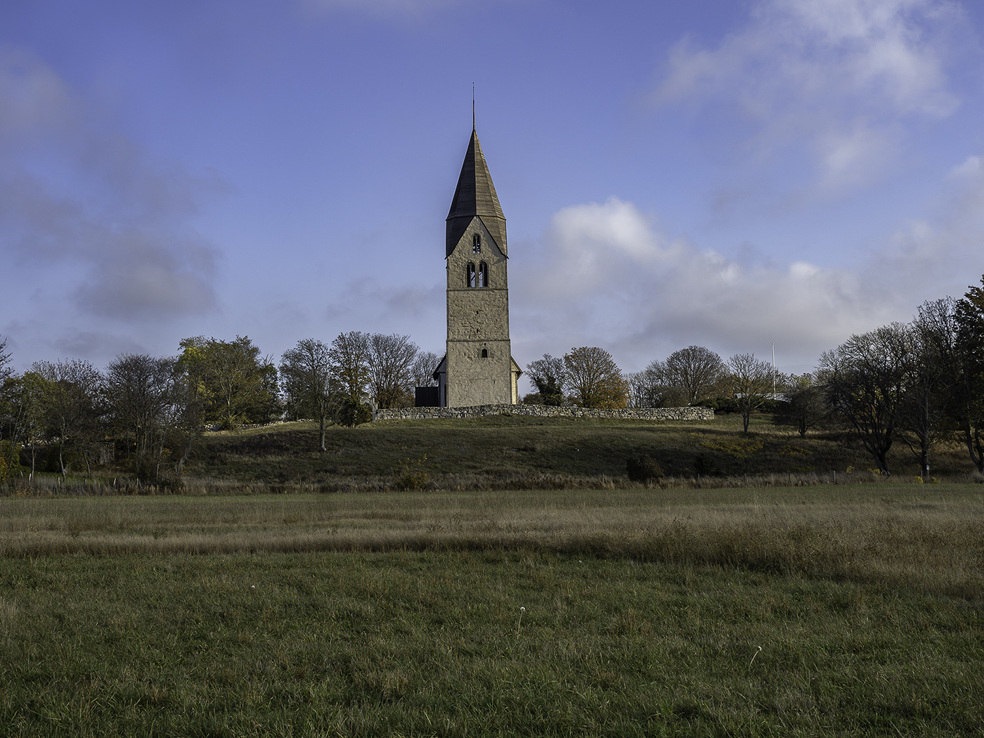 På platsen låg sannolikt en äldre träkyrka, innan dagens kor och långhus av sten uppfördes i början av 1200-talet. Tornet tillkom troligen i mitten av 1200-talet. Sakristian är från 1870. Nordost om kyrkan ligger en kastal; Gotlands sydligaste, uppförd under tidig medeltid (1100-tal). I dag är kastalen 12 meter hög, men beräknas ursprungligen ha varit 14 meter hög.